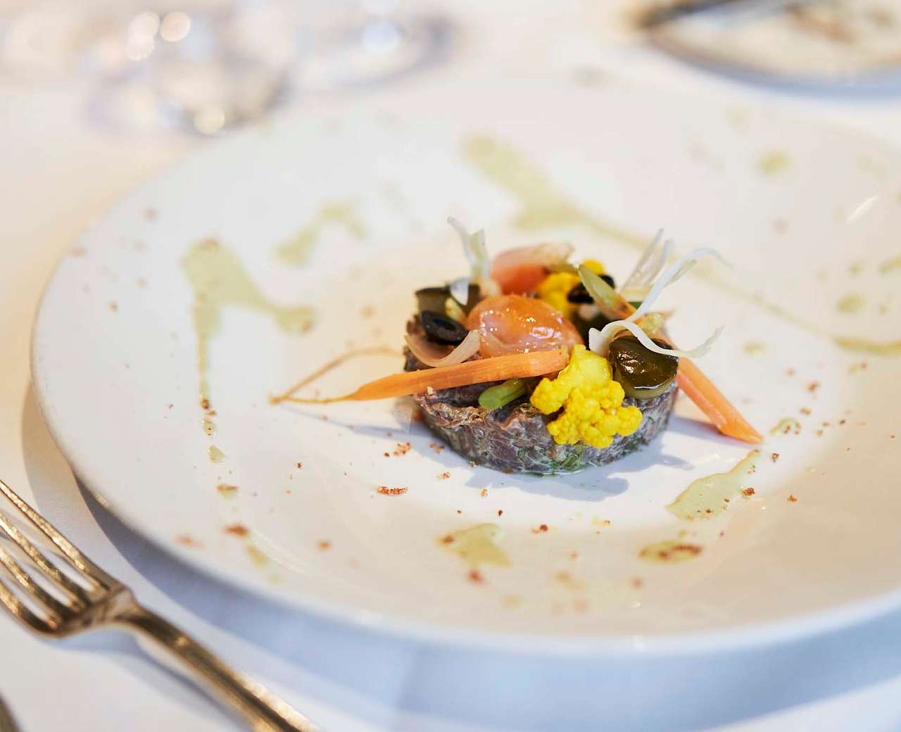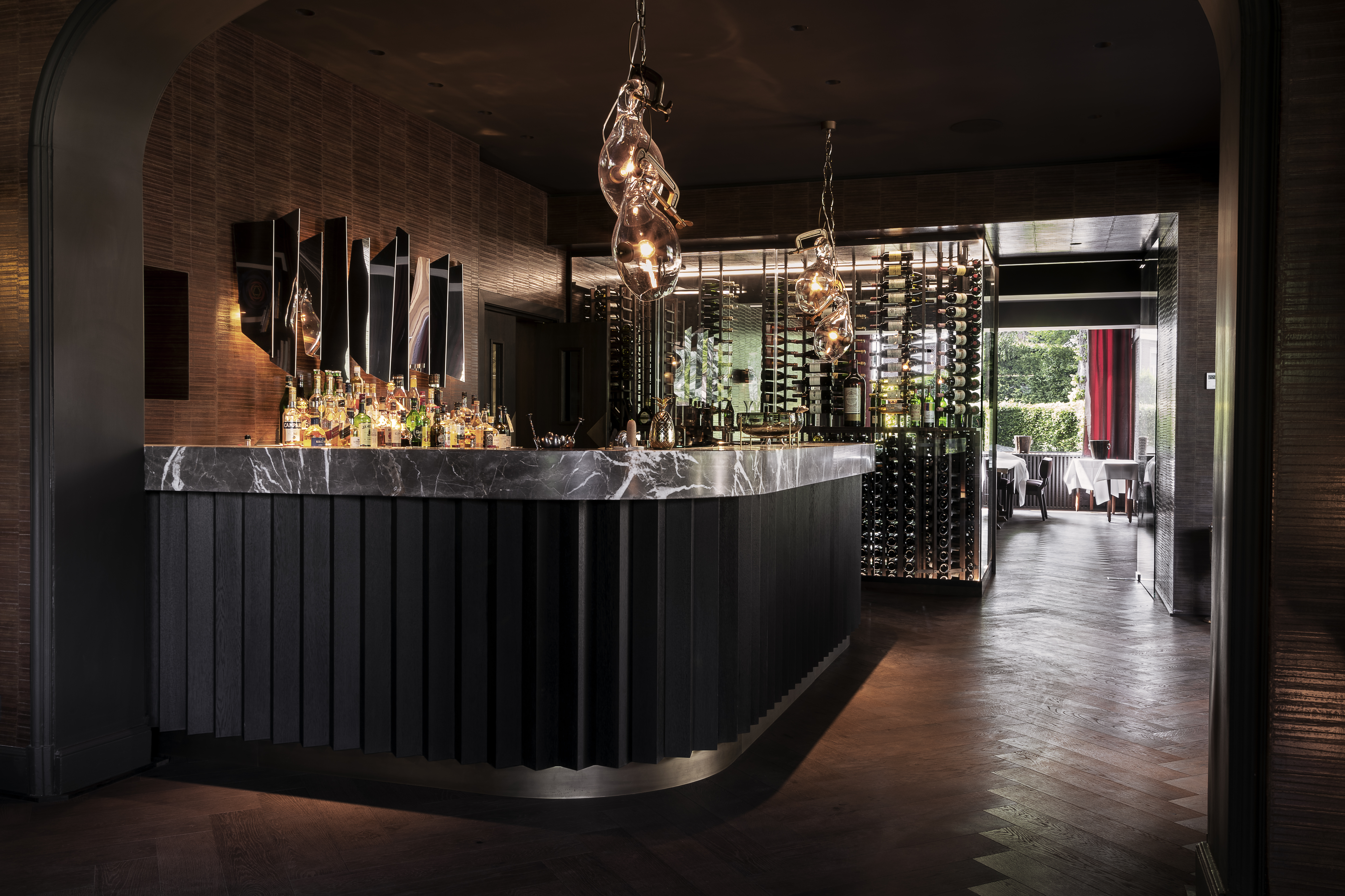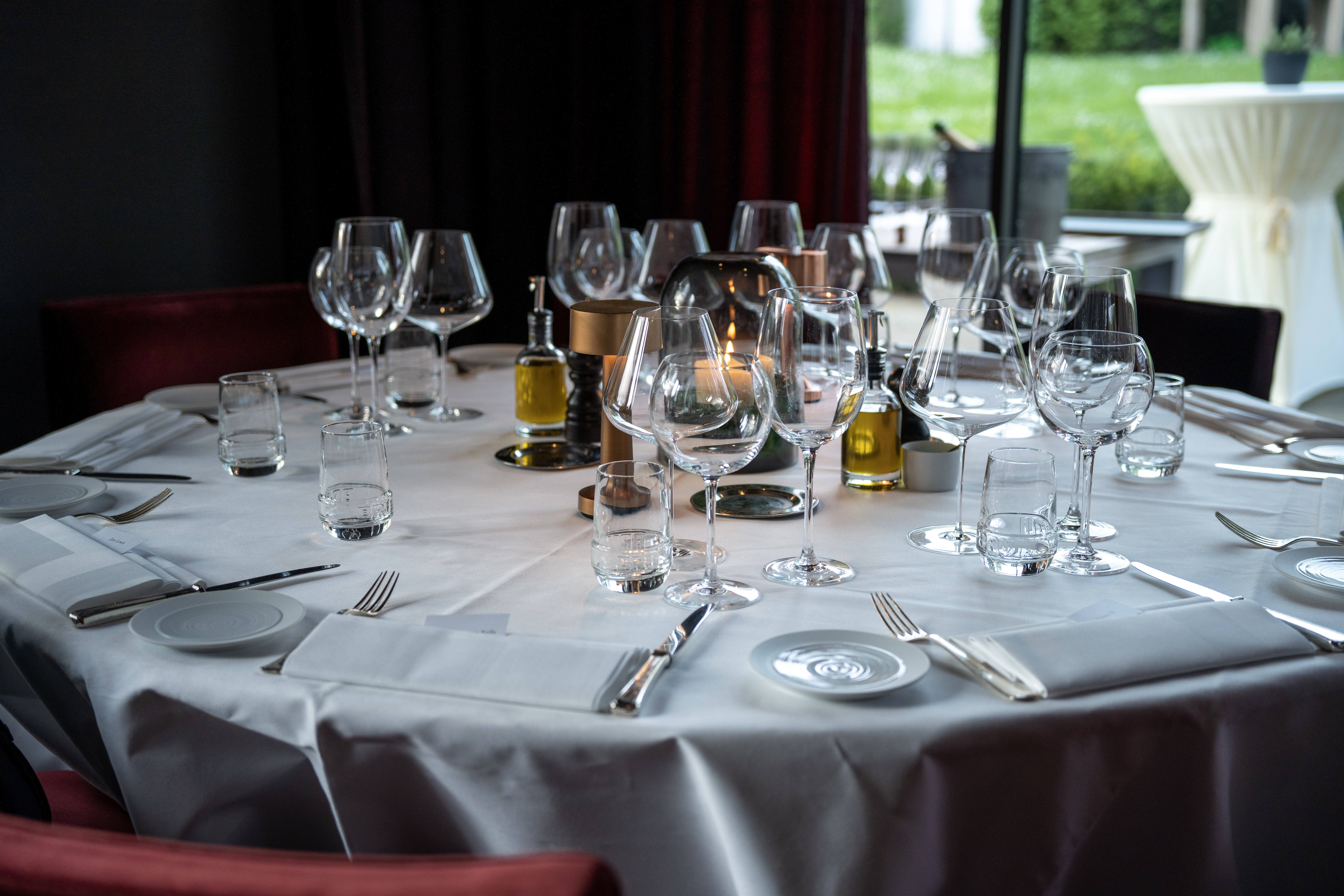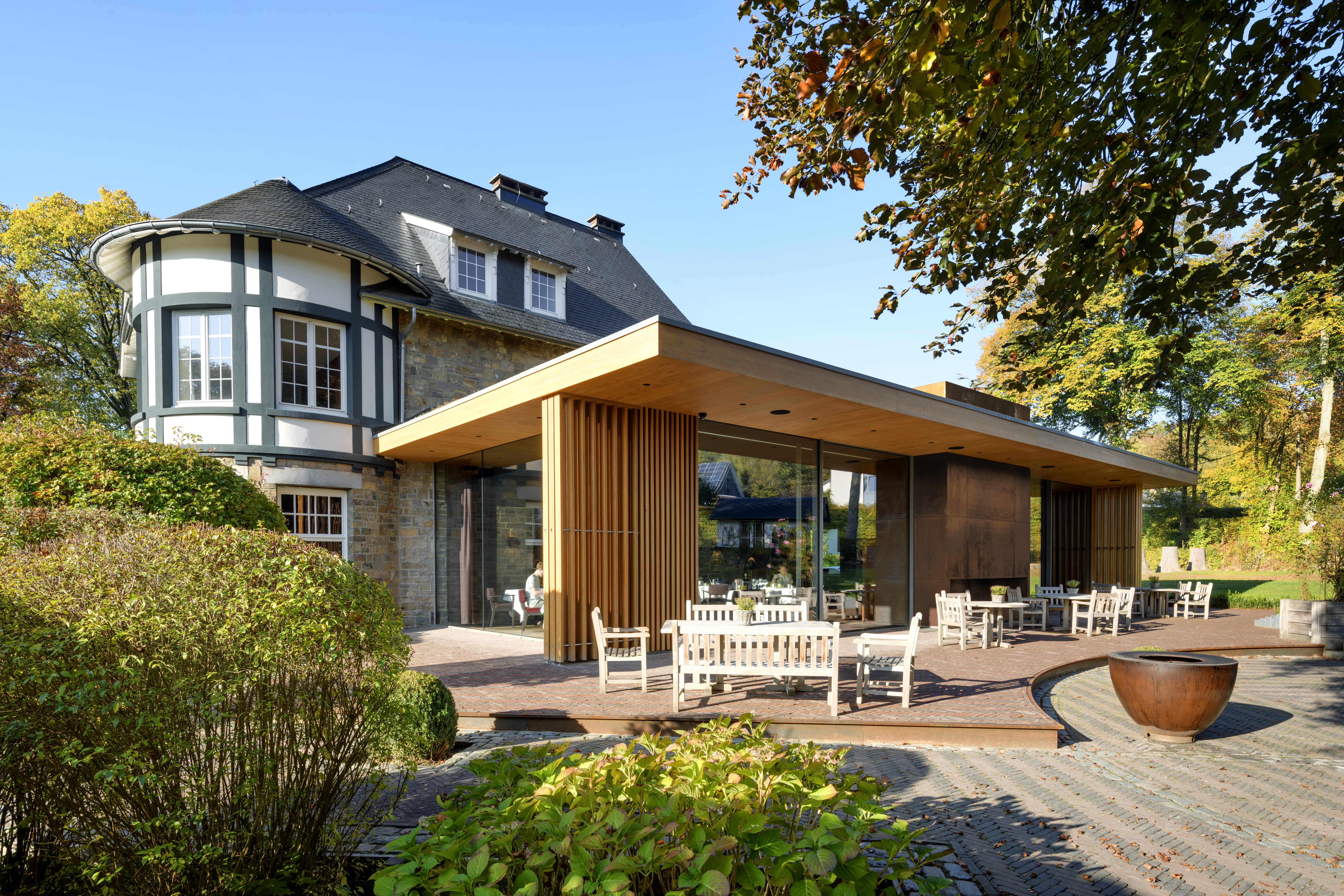 In einem stilvoll modernisierten Landhaus von 1934 verbindet das Restaurant ländlichen Charme mit zeitgemäßem Design. Große Fenster eröffnen den Blick in die Natur, Terra...