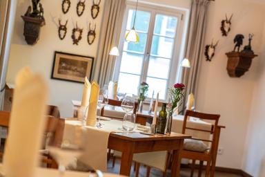 Das Romantik® Hotel Meisenheimer Hof in der historischen Altstadt von Meisenheim am Glan verbindet jahrhundertealte Tradition mit moderner Gastlichkeit. Besonderes Augenmerk liegt auf der ausgezeichneten Kulinarik des Hauses. Der prämierte Küchenchef und Gastgeber Markus Pape, kreiert mit seinem Team innovative Gerichte, die regionale Produkte mit internationalen Einflüssen vereinen. Die Speisekarte bietet eine Vielfalt an Menüs, darunter auch vegetarische Optionen, die saisonal wechseln und stets höchste Qualität garantieren. Die verschiedenen Gasträume des Restaurants, wie der historische Raum „Zur Blume“ mit seiner zweihundertjährigen Holztäfelung, das gemütliche „Jägerzimmer“ oder die „Brunnenstube“ mit mittelalterlichem Brunnen, schaffen ein einzigartiges Ambiente für jeden Anlass. Bei schönem Wetter lädt der schattige Innenhof, der von der alten Stadtmauer begrenzt wird, zum Verweilen ein. Ergänzt wird das kulinarische Angebot durch das hauseigene Café „Meisentörtchen“, das mit süßen Köstlichkeiten aus der eigenen Patisserie verwöhnt. Hier können Gäste hausgemachte Kuchen und Torten in gemütlicher Atmosphäre genießen. Für Weinliebhaber bietet der Meisenheimer Hof eine beeindruckende Auswahl an Weinen, insbesondere vom eigenen Weingut Disibodenberg, das mit einer Vielzahl von Rot- und Weißweinen sowie Sekten und Bränden überzeugt. Regelmäßige Weinproben und Veranstaltungen rund um das Thema Wein bereichern das Angebot zusätzlich.