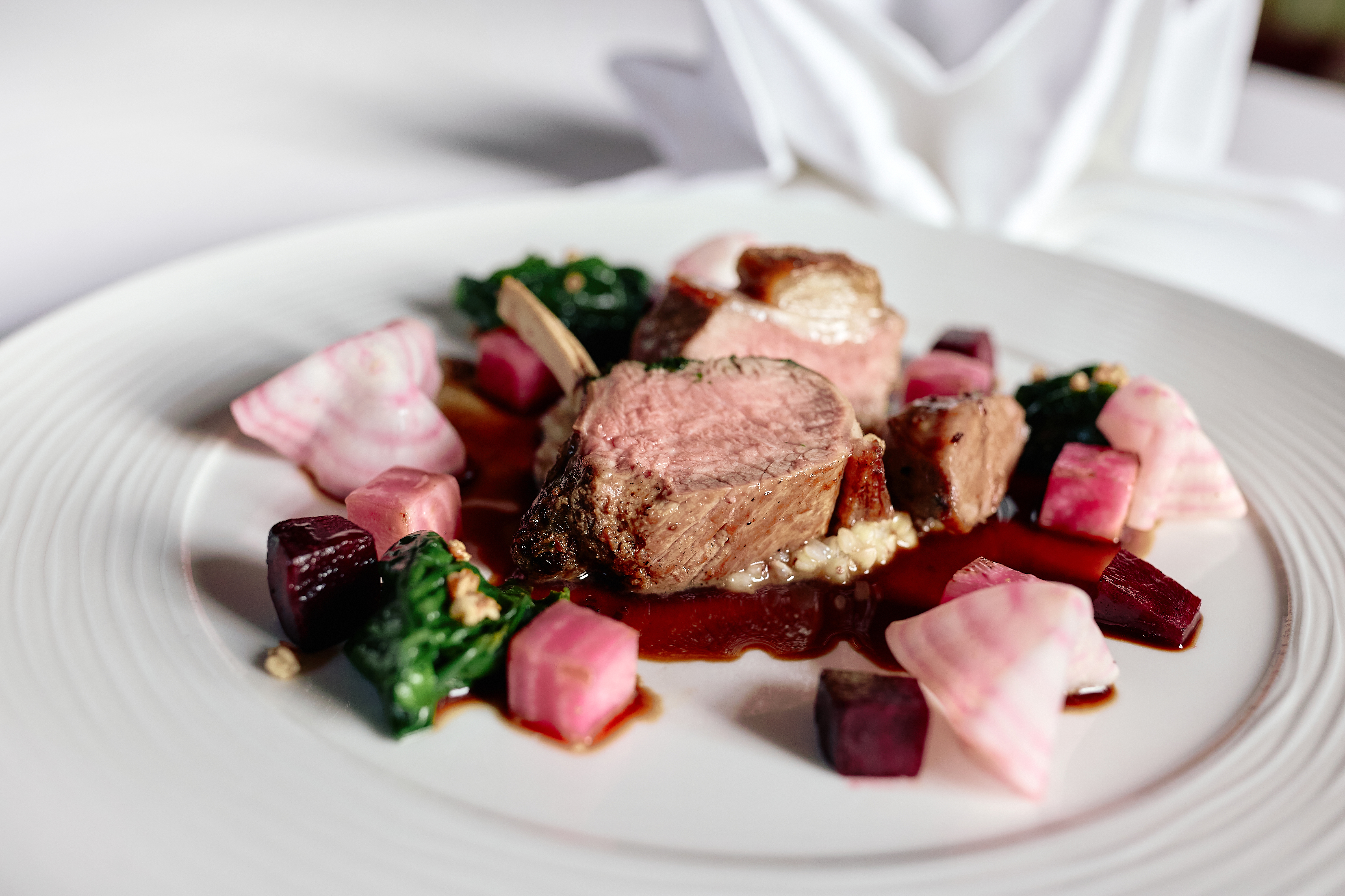 Die Gerichte der Dorfstube werden aus hochwertigen und vorwiegend regionalen Zutaten auf feine, oftmals schonende Art zubereitet, etwa bei den 24 Stunden gegarten Würfeln...