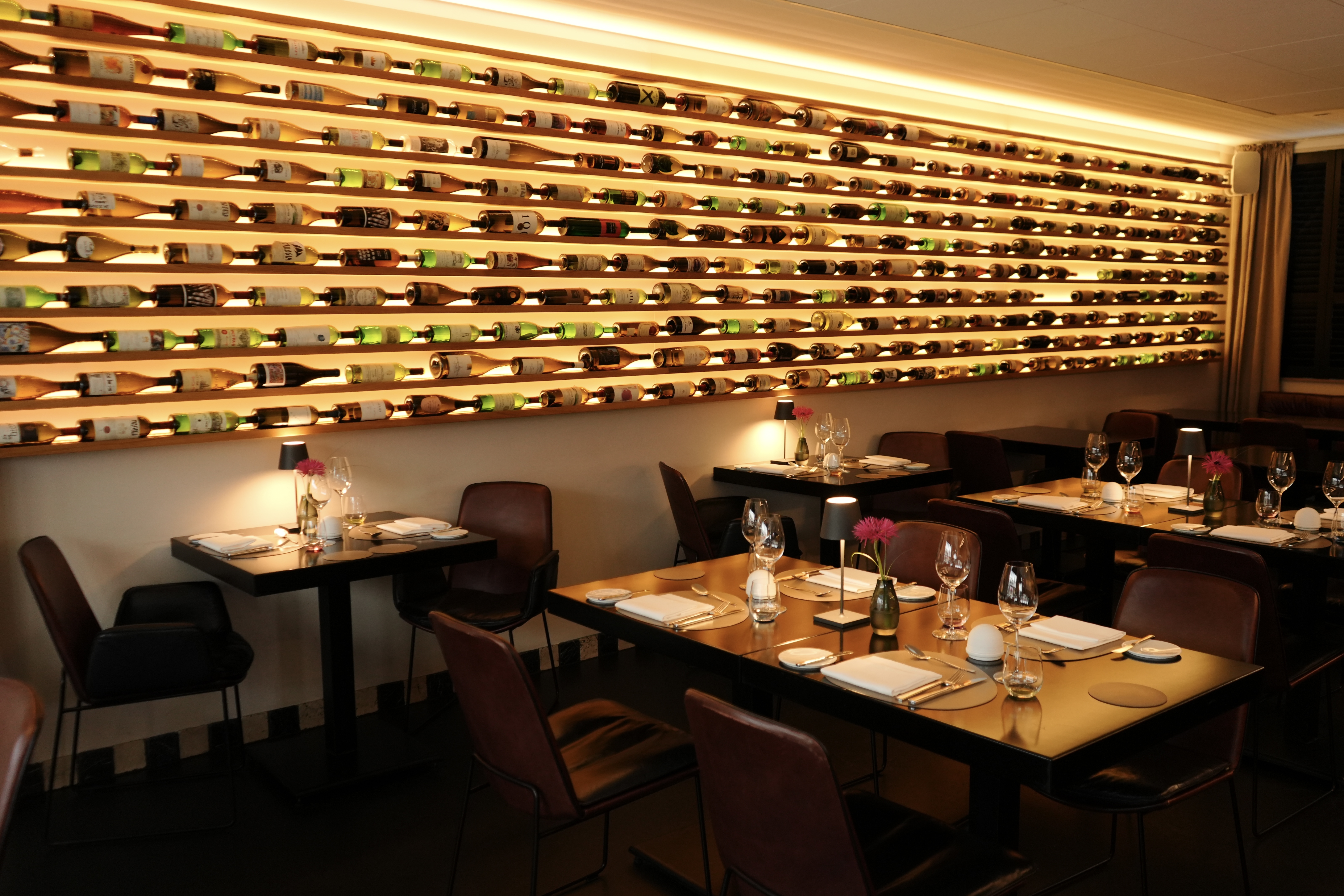 Genussvolle Adresse mit guter mediterraner Küche im Herzen von Bielefeld, modern-mediterranes Menü an schnörkellosen Tischen mit hinterleuchteten Flaschen als Wandschmuck, offene Küche und griechischer Wein.