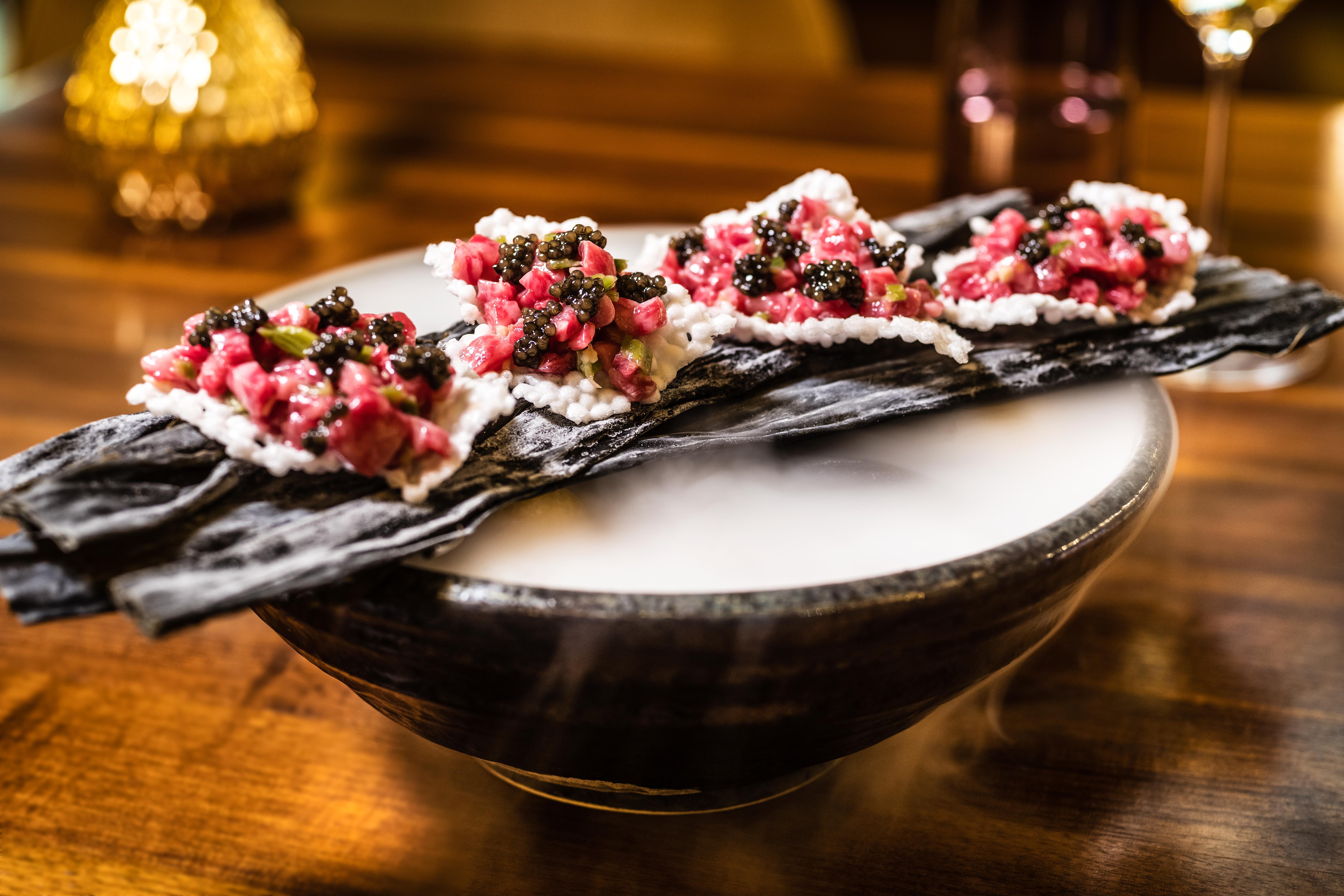 Glamourös schillert das Souterrain in Gold, Cognac und Schwarz, wohin man schaut: glänzendes Holz, opulente Stoffe und schimmernde Lampen. Die japanisch-peruanische Nikkei-Cuisine passt dazu!
