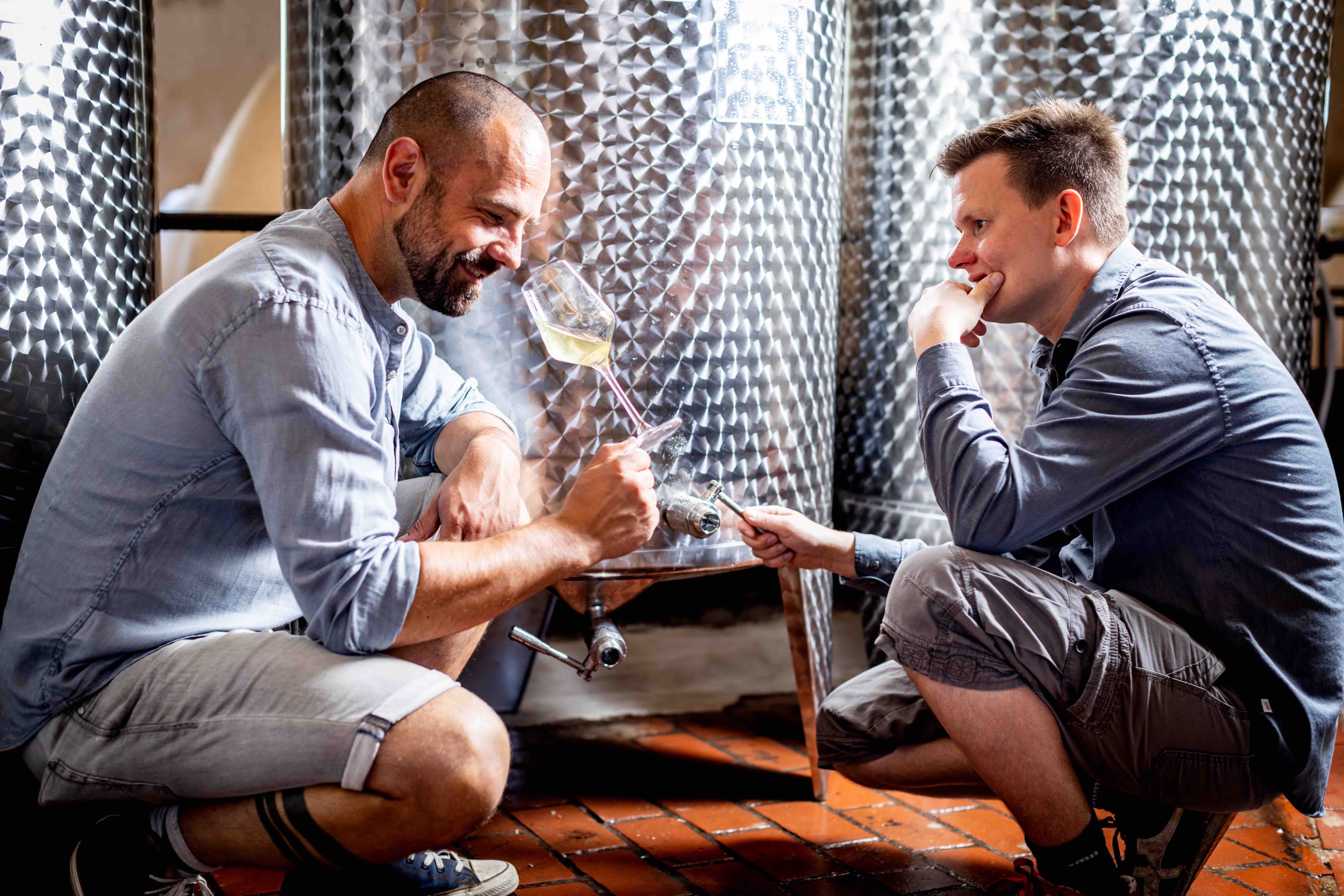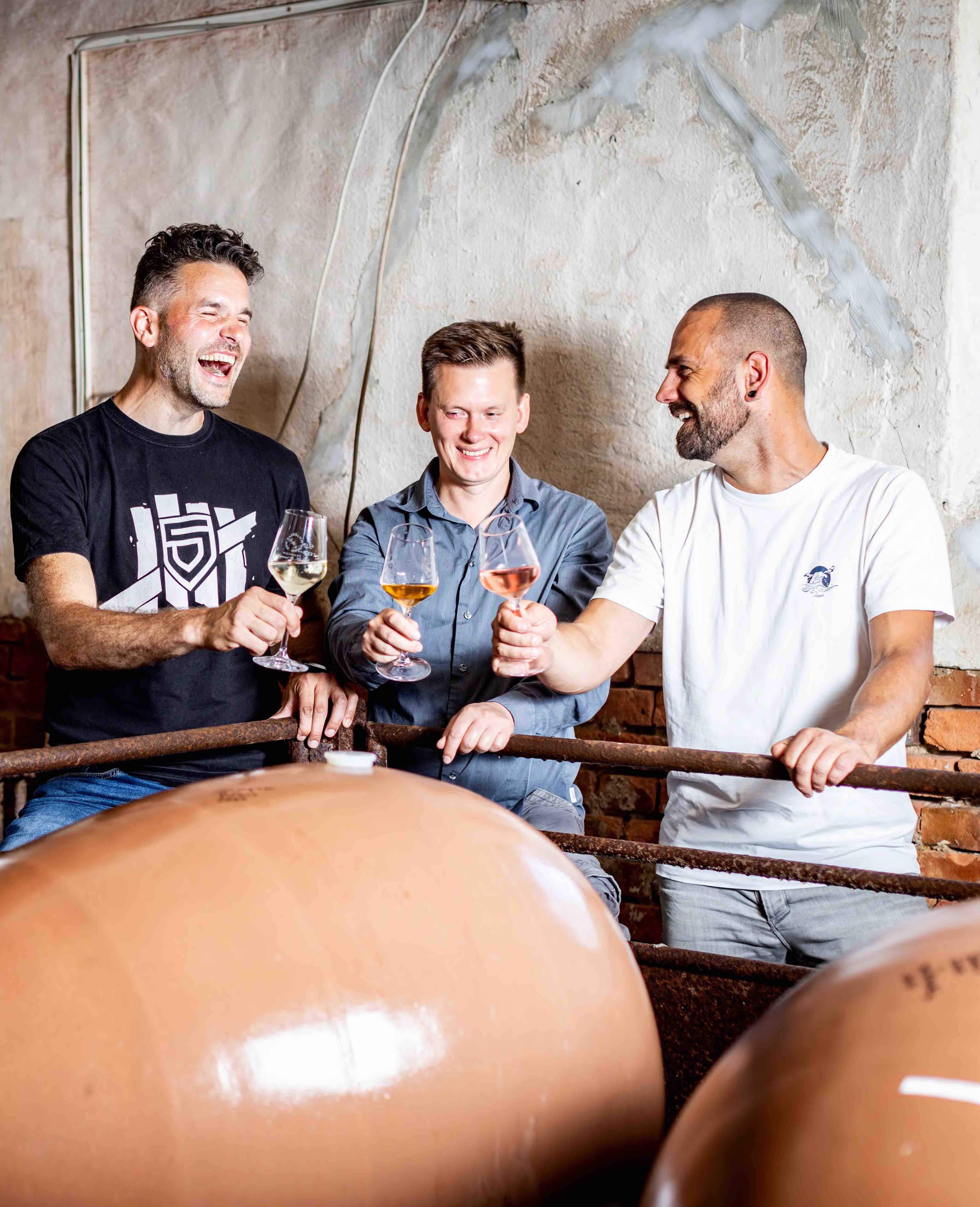 „Wir sind mit unserem Weingut umgezogen und freuen uns, wenn wir bald mal wieder Leute begrüßen können“, sagt Daniel Zein, der sich wie seine Freunde Sören und Sebastian als rebellischer Weinmacher versteht. „Wir wollen uns keiner Konvention hingeben.“ Der 22er Zweigelt wurde in der Tonamphore ausgebaut und ist sehr reduktiv. „Wir haben nur einen Stahltank im Keller. Ansonsten haben wir Gär-Eier, Sandstein, Amphoren oder Holz. Und wir wollen noch Granit dazunehmen, wenn wir uns das leisten können“, lacht Daniel Zein, „Weine für Kenner und Freaks“.