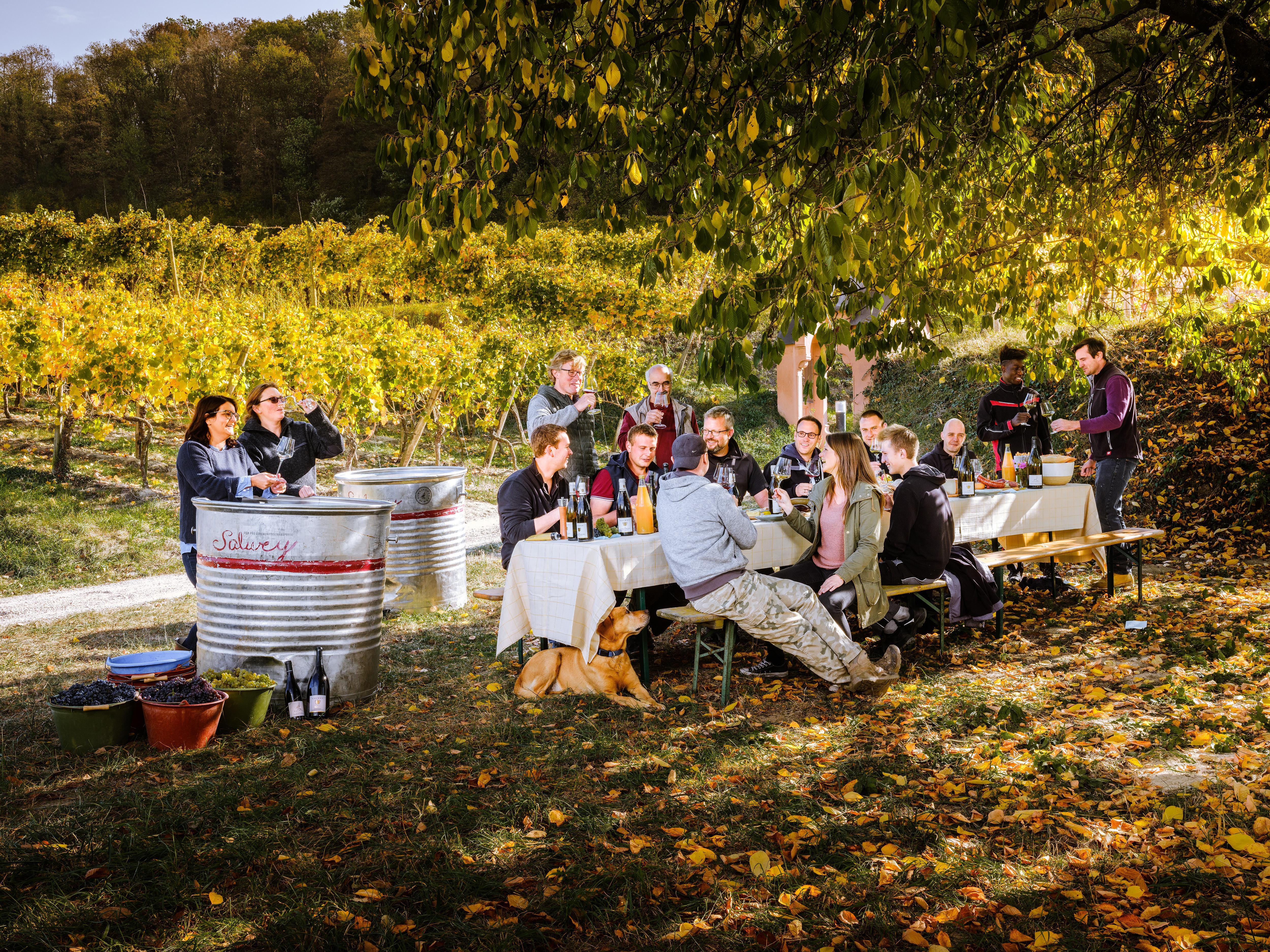„Ich muss meinen Mitarbeitern immer wieder Danke sagen“, zeigt sich Konrad Salwey berührt. „Wir sind seit Jahren dieselbe Mannschaft, es geht keiner und es kommt keiner.“ Gerade im Hinblick auf die konsequent-selektive Handlese liegt hierin ein echter Schlüssel zum Erfolg. „Ich kann mich auf die Erfahrung von allen blind verlassen, sodass ich im Keller kaum noch einzugreifen brauche.“ Sein wichtigstes Betätigungsfeld dort sieht Salwey beim Zeitmanagement. Dass seine Weine inzwischen mit immer größerer Verzögerung auf den Markt kommen, liege an der längeren Fassreife auf der Hefe, die die Weine spürbar runder mache und nicht etwa auf Faulheit seinerseits zurückzuführen sei, scherzt Salwey.